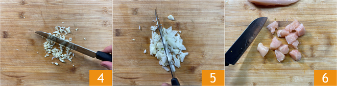 Do the same for the garlic 4 and onion 5. Clean the chicken breast of fat and any small bones, then cut it into chunks 6.