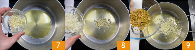 In a pot, heat the oil and add the garlic 7 and onion 8, and sauté over medium-high heat for a few minutes. Then add the olives 9.