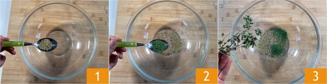 To prepare the pan-fried chicken thighs, first mix the rosemary 1, parsley 2, and dried oregano 3 in a large bowl.