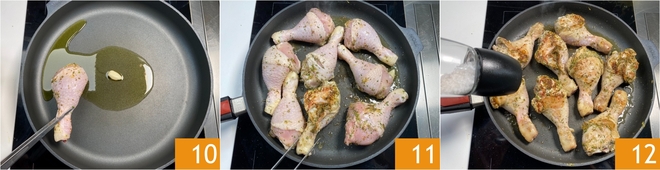 You are ready to cook: in a non-stick pan, heat the oil with a clove of garlic, then place the chicken thighs 10 and brown them gently on all sides 11. Once well browned, salt 12.