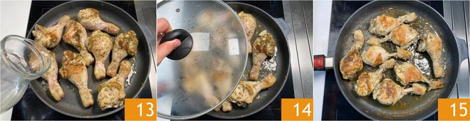 Deglaze with the white wine 13 and let it evaporate completely, then add the water, cover with the lid 14, and cook for 30 minutes, still over low heat. After this time, remove the lid and continue cooking for another 10 minutes 15. Your pan-fried chicken thighs are ready to be served!