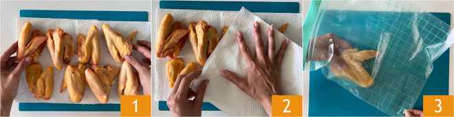 To prepare the chicken wings with the air fryer, wash the chicken wings, place them on a paper towel 1 and pat them dry 2. Remove any feather remnants by burning them. Place the wings in a food-grade plastic bag 3.