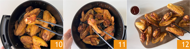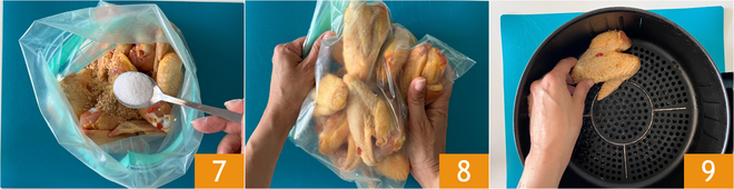 Salt them 7, close the bag and shake it vigorously to season the meat 8. Let the wings rest in the refrigerator for an hour in the bag so they absorb the flavors. Place the wings in the air fryer basket 9 and cook at 392°F for 34 minutes. We used a 7-liter air fryer.
