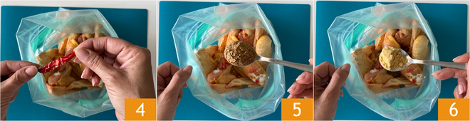 Add the chili pepper 4, cumin 5, mustard 6, and garlic powder.