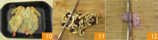 Place the chicken in a baking dish with the open side facing down 10 and bake in a preheated static oven at 428°F for 15-20 minutes, then lower to 374°F and continue cooking for another 15-20 minutes or until the internal temperature of the thigh reaches 162°F. Meanwhile, coarsely chop most of the mushrooms 11 and set aside some of the nicest ones for the side dish 11. Trim and finely chop the shallots 12.