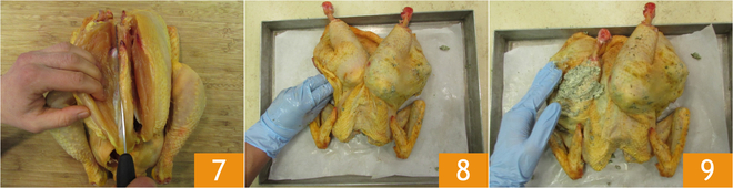 Take the whole chicken, cut halfway through the breastbone 7 and remove the backbone, then open and flatten it with your hands (you can ask your trusted butcher to do it for you). Spread the flavored butter between the skin and the meat of the chicken, massaging well 8, then cover the surface as well 9.