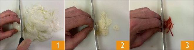 To prepare chicken yassa, first clean and finely slice the onions 1, then cut the garlic 2 and chili pepper 3 into thin slices.