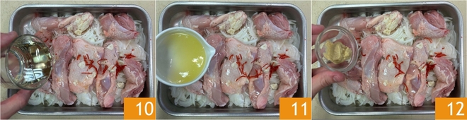 Pour in the seed oil 10, lemon juice 11, and mustard 12.