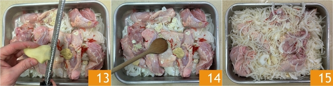 Finally, grate the fresh ginger 13, mix with a wooden spoon 14 and let it marinate for 6-8 hours in the refrigerator, covered with plastic wrap 15.
