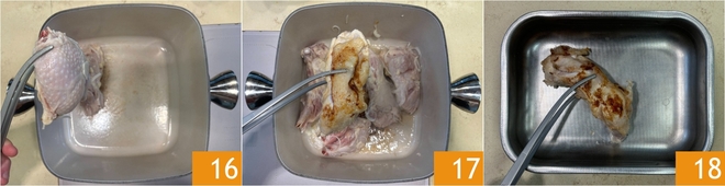 After marinating time, remove the chicken, transfer it to a non-stick pan 16 and brown it skin side down for 3 minutes, then turn it and brown for another 3 minutes on the other side 17. Once toasted, set the chicken aside 18.