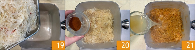 In the same pan, pour the onions, after draining them from the marinade liquid 19. Salt and cook over medium-high heat for about ten minutes; when the onions are golden, add the paprika 20 and stir for a few minutes, then cover with hot chicken broth 21.