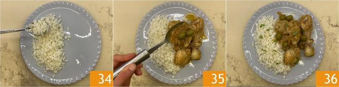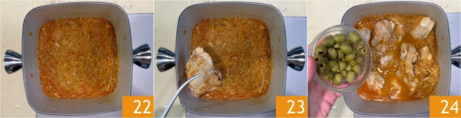 Cook for about 30 minutes 22. After this time, add the chicken 23 and green olives 34. Cover with the lid and cook for another 30 minutes over medium-low heat.
