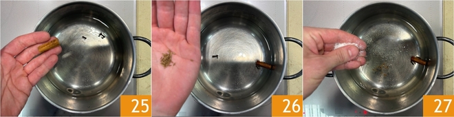 In the meantime, prepare the rice: pour the water into a pot, then season with the cinnamon stick 25, cloves, cumin seeds 26, and coarse salt 27.