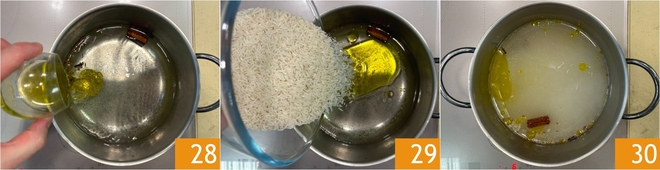 Add the oil 28 and turn on the heat. When the water is almost boiling, pour in the rice 29 and cook over medium heat for 12 minutes; the water should simmer 30.
