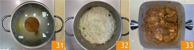 After the cooking time, turn off the heat, cover with the lid, and let it rest for 2 minutes 31 so that it absorbs all the water 32. In the meantime, the chicken's cooking time will also have elapsed; check that it has absorbed almost all the broth 33.