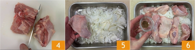 If the chicken thighs are large, cut them into 2 parts 4. Put the onions in a large baking dish, then place the chicken pieces 5 and sprinkle with cumin seeds 6.