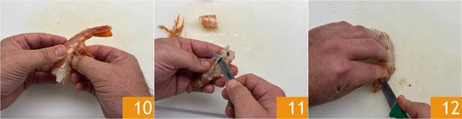 Now focus on the shrimp: clean them by removing the head, legs, and shell 10. Cut a slit along the back of the shrimp 11 and remove the intestinal vein with the tip of a knife 12. Transfer the shrimp to a tray lined with paper towels and keep them in the refrigerator until use.