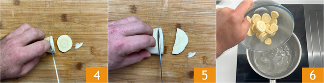 Slice the smaller part into 0.4-inch thick rounds 4. Divide the larger part in half and slice to obtain half-moons again 0.4-inch thick 5. Blanch the parsnip for a few minutes 6.