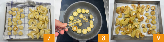 Drain the parsnip and let it dry on a clean towel 7. In a pan, pour a drizzle of oil, lay down the parsnip slices, season with salt, and roast on both sides 8. When they are golden, transfer the slices to paper towels to remove excess oil 9.