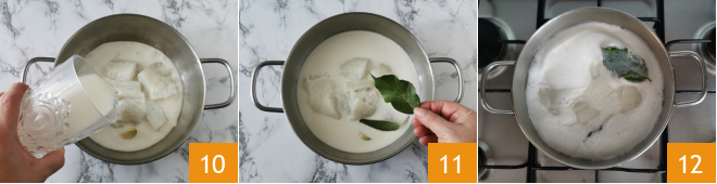 Pour in the milk 10, sage, bay leaf 11, and cook on medium heat for 5 minutes 12.