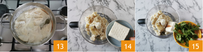 Turn off the heat and let it cool 13. Drain the cold salt cod from the saucepan and place it in a blender. Add the crescenza cheese 14, a pinch of salt, a teaspoon of pepper and a teaspoon of nutmeg. Flavor with the parsley 15 and blend for a few minutes.