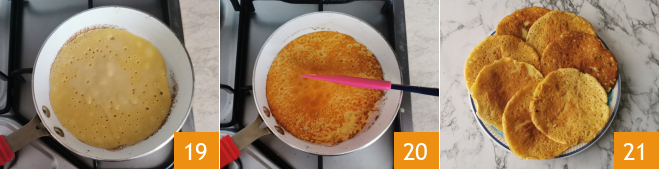 Cook for 1-2 minutes 19 then flip the crepe with a spatula. Cook the other side as well 20. As you cook the crepes, place them on a plate 21.