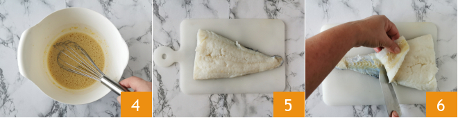 Mix with a hand whisk and let it rest for an hour 4. Move on to preparing the salt cod mousse. Place the already soaked salt cod fillet on a cutting board 5, make a small incision at the tail end and with a sharp kitchen knife separate the flesh from the skin to remove the latter 6. Slide the blade along the cutting board, holding the tail part with the other hand, to make the blade glide better.