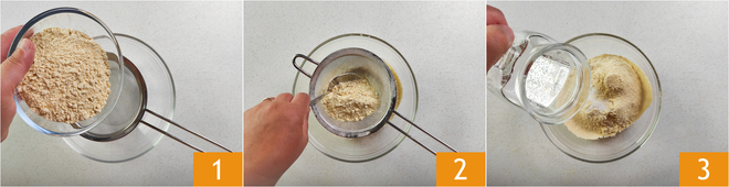 To prepare the chickpea flour flatbread, sift the flour 1 2. Add a pinch of salt and water at room temperature 3.