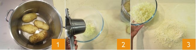 To prepare the chickpea flour gnocchi, first boil the potatoes. Place them in a pot, cover with cold water, and let them cook for about 30-40 minutes 1, until they are soft when pierced with a fork. Then drain them and, being careful not to burn yourself, mash them while still hot in a bowl 2. Using a potato ricer will allow you to avoid peeling them, as the peel will remain inside. Then place the chickpea flour in a mound on a work surface and add the potatoes in the center 3.
