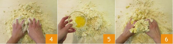 Knead everything with your hands 4, then recreate the mound and place the egg in the center 5. Work the mixture again 6.