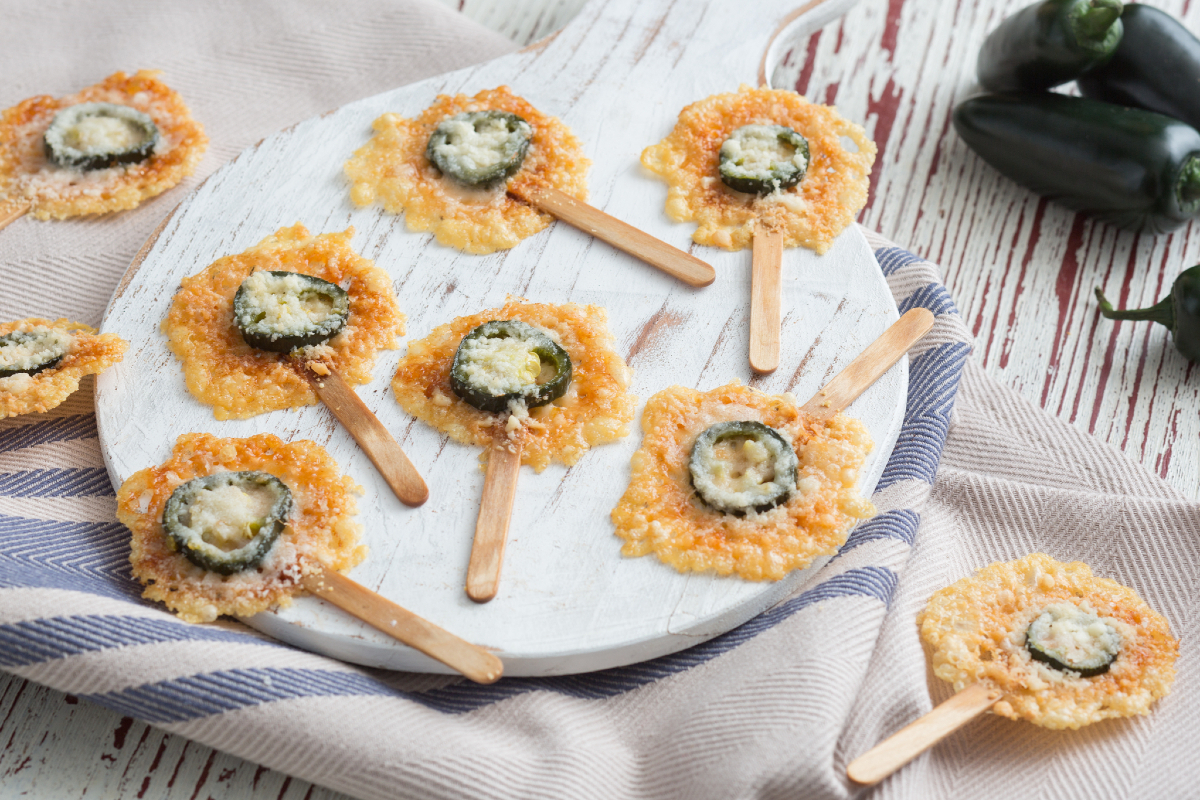 After this time, sprinkle a bit more Grana Padano on top of the chili pepper slices to cover them further 7 and bake for another 2 minutes, until the cheese is melted and golden 8. Remove from the oven and let the chili pepper and Grana Padano lollipops cool before serving and enjoying them 9!