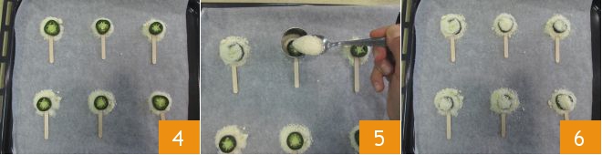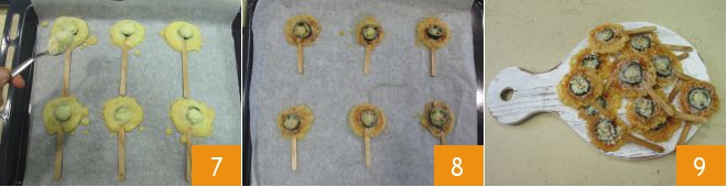 Now place a slice of chili pepper in the center of each disc 4 and cover with another teaspoon of Grana Padano PDO, again using the round cutter 5. Once ready 6, bake the lollipops in a preheated static oven at 375°F for about 10 minutes.