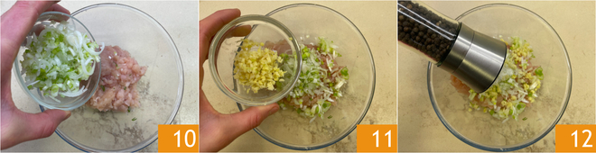 Place the minced meat in a bowl, then add the white part of the scallion 10, ginger 11, salt, and pepper 12.