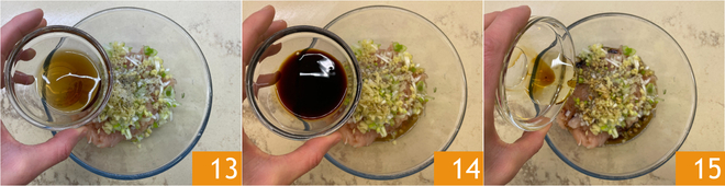 Also pour in the rice wine 13, soy sauce 14, and sesame oil 15.