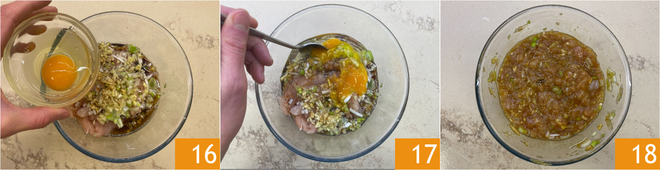 Finally, add the egg 16 and mix everything well with your hands or a fork 17. Let the mixture rest in the fridge for 30 minutes 18, covered with plastic wrap.