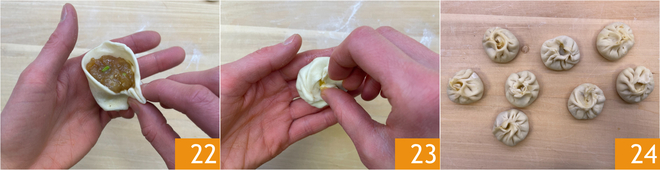 Fold the disc and make small pleats starting from one end, while with the other hand, bring the dough edges towards the center and push the filling down 22. Finally, crimp the seal to enclose the filling inside 23 and obtain a rounded shape 34.