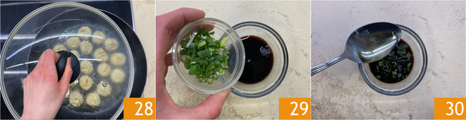 Cover with the lid 28 and cook for 10-15 minutes. Meanwhile, prepare the accompanying sauce: in a small bowl, pour the soy sauce, the green part of the scallion 29, and a splash of rice vinegar 30.
