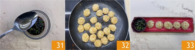 Add also a teaspoon of sesame oil 31 and mix. After the cooking time of the dumplings, remove the lid and let dry for another 2 minutes 32; the base should be golden. Serve your Chinese meat dumplings immediately alongside the accompanying sauce 33!