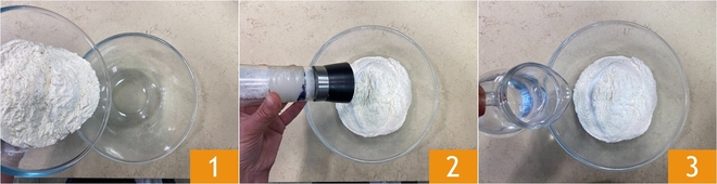 Mix with chopsticks 4, or alternatively with a fork, and continue pouring the water slowly. You should obtain a dough that is not too smooth, ensuring the water is well absorbed 5. Then transfer the dough onto a work surface 6.