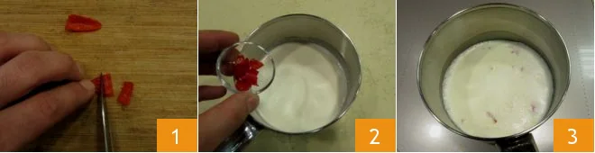 To prepare the chocolate and chili mousse, start by cleaning the latter. Cut it in half lengthwise, remove the seeds with the tip of a knife, and chop it coarsely 1. Add it to the cream 2, which you will bring to a boil and then let it rest for two hours so that the chili releases its properties 3.
