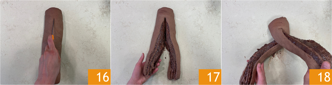Once rolled, make a cut starting 1-1.5 inches from one of the ends of the roll 16, cut to the other end to create two parts 17. Begin braiding them 18.