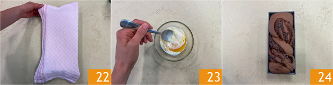 You can brush it with the milk and egg mixture 25, then bake at 356°F for 20-25 minutes. Once baked, remove from the oven 26, let cool, then remove from the pan and slice to share your chocolate babka 27.