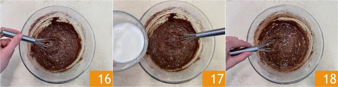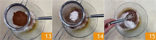 Sift the cocoa 13 and baking powder 14 as well, then mix everything thoroughly 15.