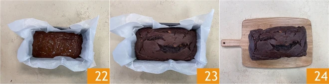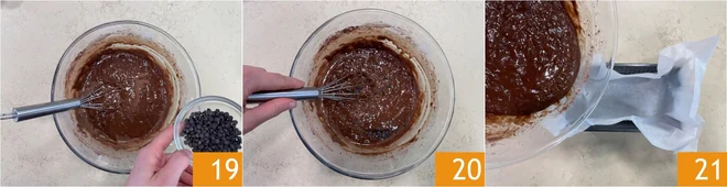 Finally, add the chocolate chips 19 and incorporate them uniformly into the mixture 20. Pour the batter into a loaf pan lined with parchment paper 21.