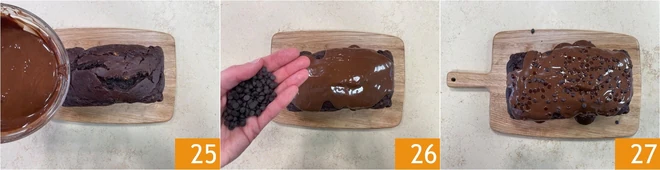 Melt the milk chocolate in the microwave or in a bain-marie and let it drizzle over the surface of the banana bread 25, then garnish with more chocolate chips. Your chocolate banana bread is ready to be enjoyed 27!