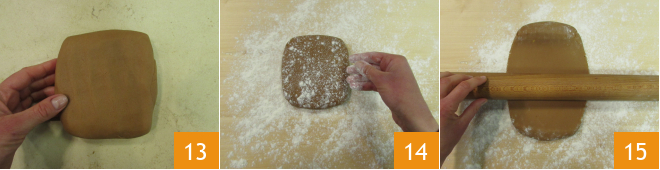 Form a dough ball 13, wrap it in plastic wrap and let it rest in the refrigerator for at least 30 minutes. After this time, take the shortcrust pastry, place it on a floured surface, and lightly dust the dough ball as well 14. Roll out the dough with a rolling pin 15 until it reaches a thickness of 1/8 inch.