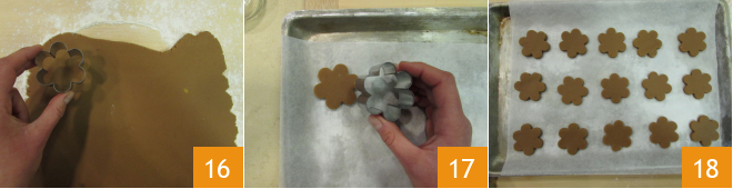 Using a flower-shaped cutter of approximately 2 inches, cut out the cookies 16 and transfer them onto a baking sheet lined with parchment paper 17. Knead the scraps again, roll them out, and cut them until all the dough is used 18.