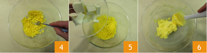 Crush the yolks with a fork 4. Chop the chocolate and melt it in a bain-marie or in the microwave, then let it cool slightly. Add the softened butter to the yolks 5 and work with a rubber spatula until a creamy consistency is obtained 6.