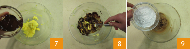 Add the melted chocolate that has cooled slightly 7 and mix the mixture with a spatula 8, then add the powdered sugar 9.