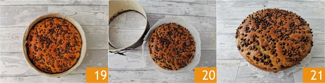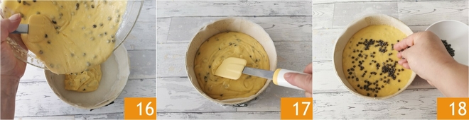 Then pour the batter into a 20 cm mold previously lined with parchment paper 16. Level the surface 17 and distribute the remaining chocolate chips on top 18.